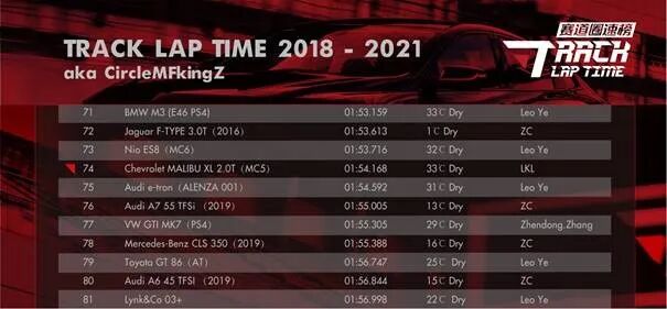 此前,在浙赛圈速榜上,20万元内量产车的最快圈速为1′56″998,该纪录自去年4月诞生以来,一直无人超越。此次,首次来到浙赛的雪佛兰迈锐宝XL,在室外超过30℃的高温中出战,最终获得1′54″168的单圈最快成绩,以领先近3秒的巨大优势打破原纪录,展现出强悍的赛道性能,并将20万内量产车的速度极限提升到新高度。